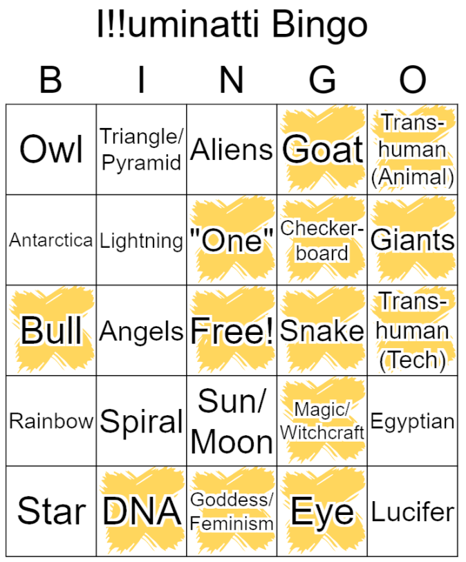 Are you interested in understanding the esoteric symbolism that pervades our culture and entertainment? The bull, the goat, lightning, the owl, the one eye, pyramids, Saturn... Do you wonder if your favorite movie, sporting event, (we're looking at you, Super Bowl) or tv show contains any of this occultic symbolism? Play Illuminati Bingo and find out!